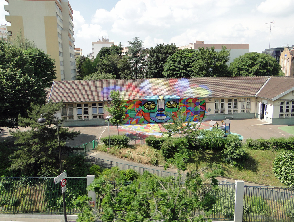 Le mur d'enceinte de l'école Cité Doré a servi de support à différents artistes... En juin 2016 l'école et sa cour, dont la destruction était programmée dans le cadre du réaménagement du quartier, ont d'abord été parées des couleurs flamboyantes de l'arc-en ciel attirant tous les regards non seulement des riverains mais aussi des passagers du métro ligne 6 pour connaitre ensuite un dernier décor, le tout entre 2 grandes fresques apparues entre-temps... L'école a été rasée au printemps 2017... et reconstruite pour la rentrée 2019, cachée derrière de hauts immeubles : disparu l'espace verdoyant et coloré (conservé par Yala Photo !), coupée net l'envolée vers le ciel...